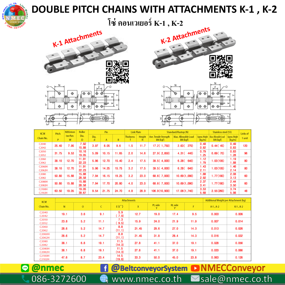 โซ่คอนเวเยอร์ Chain Conveyor แบบปีกนอน 2 ข้าง หรือ Double Pitch Chain Conveyor K-1-K-2 ทางเราก็มีจำหน่ายอยู่หลายแบบ ทั้งที่เป็นแบบลูกกลิ้งเล็ก S Roller Type หรือแบบที่เป็นลูกกลิ้งใหญ่ R Roller Type ตามตารางด้านล่างนี้