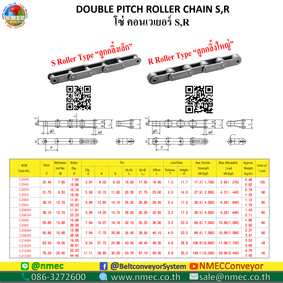 โซ่คอนเวเยอร์ หรือ Double Pitch Chain Conveyor ทางเราก็มีจำหน่ายอยู่หลายแบบ ทั้งที่เป็นแบบลูกกลิ้งเล็ก S Roller Type หรือแบบที่เป็นลูกกลิ้งใหญ่ R Roller Type ตามตารางด้านล่างนี้