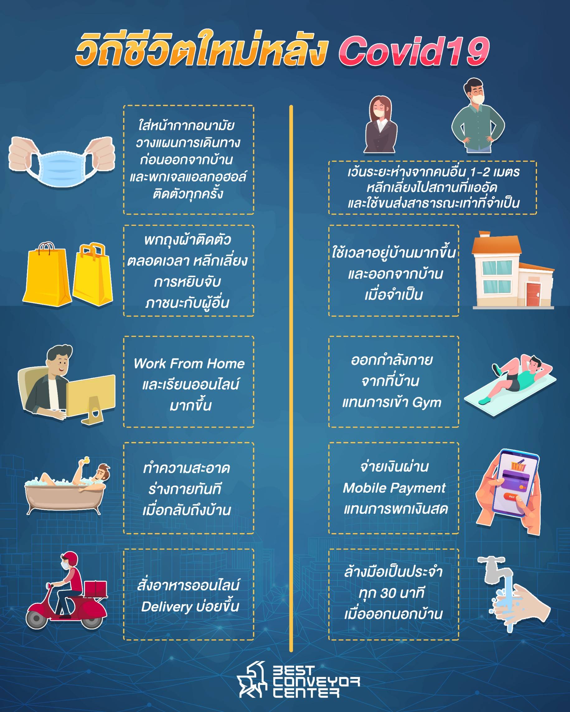 • ใช้เวลาอยู่บ้านมากขึ้น และออกจากบ้านเมื่อจำเป็นที่จะต้องเดินทางเท่านั้น